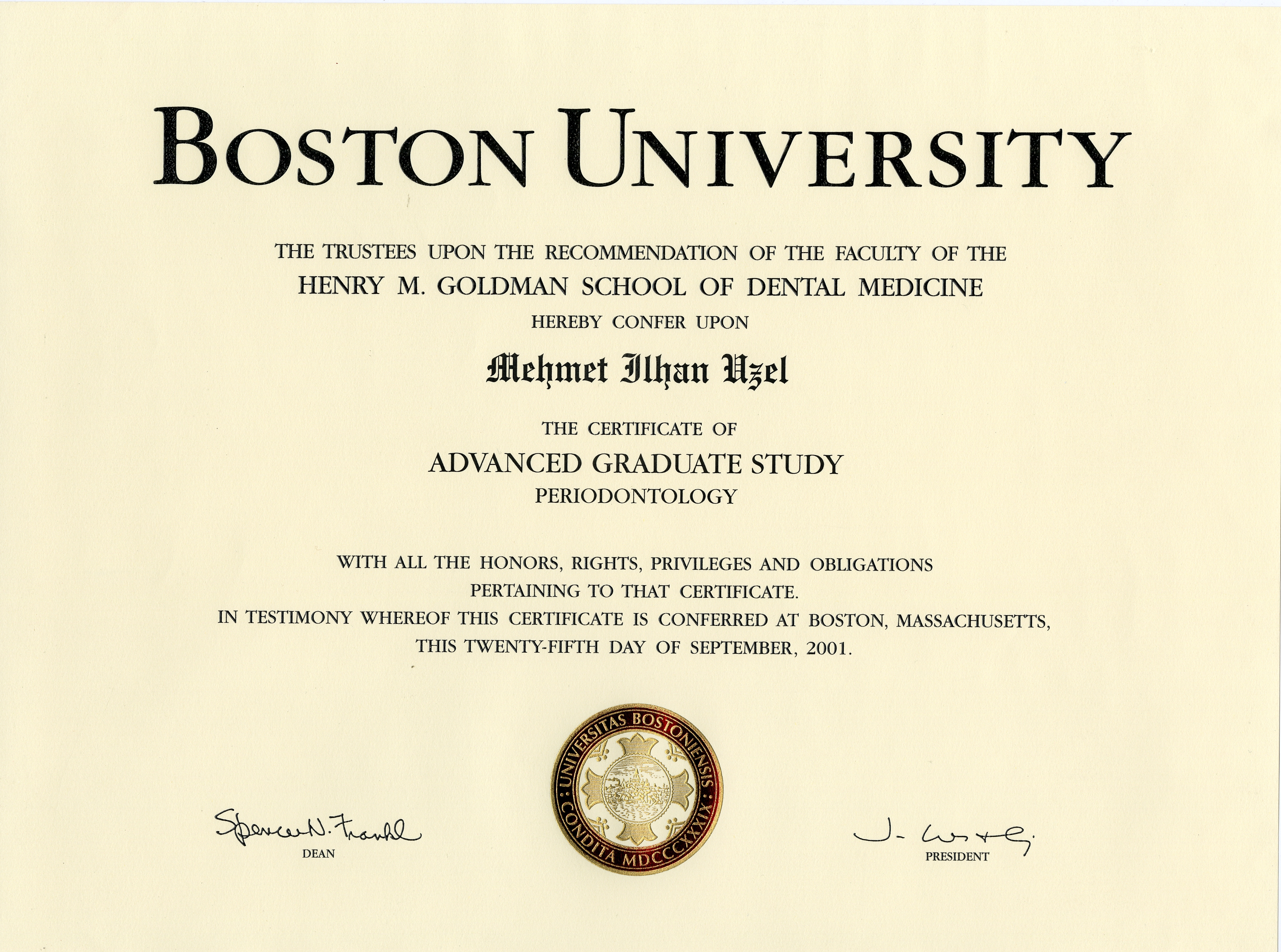 - 2001 - Certificate in Advanced Graduate Studies, (C.A.G.S. ) in Periodontology, Boston University